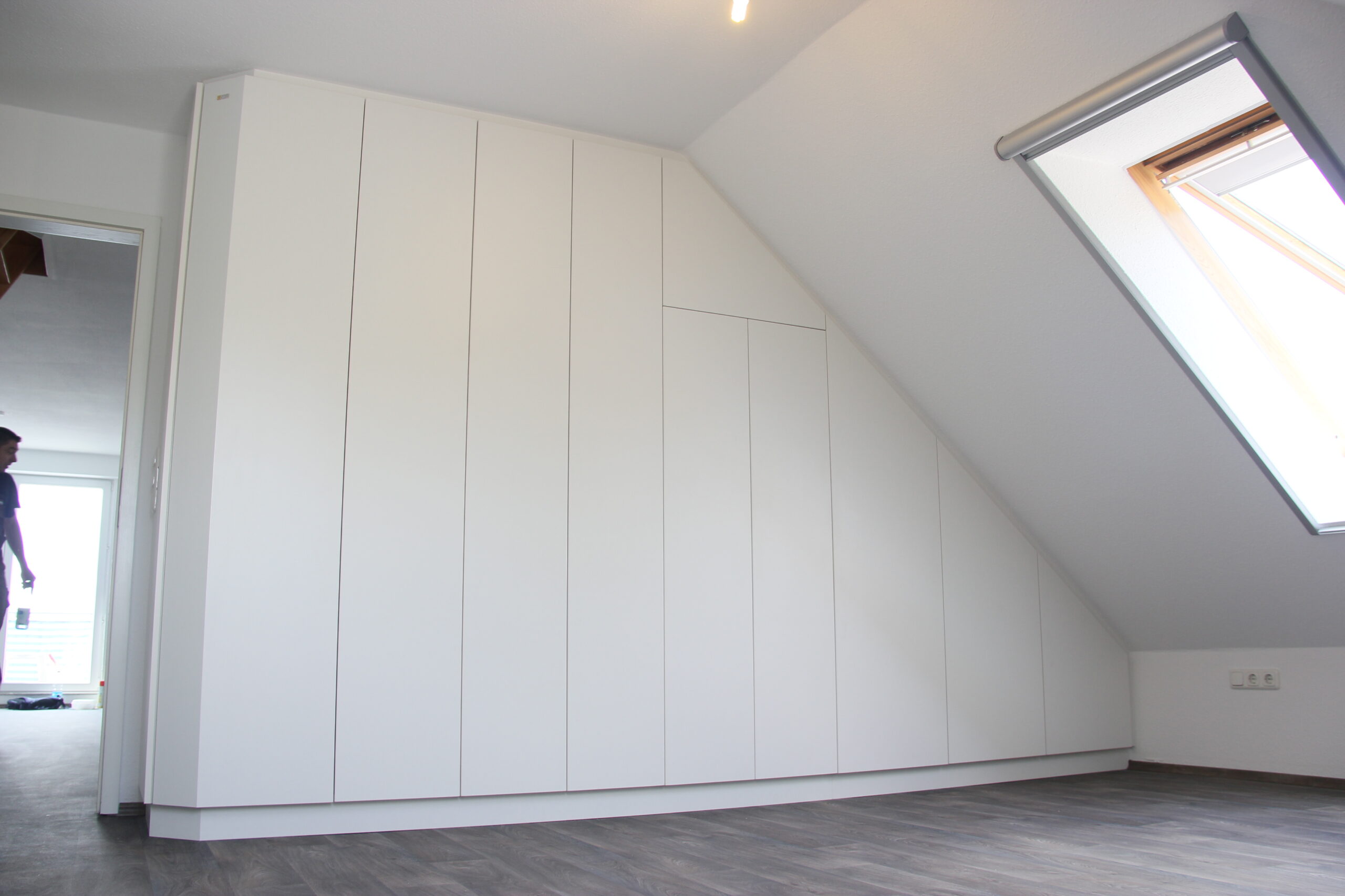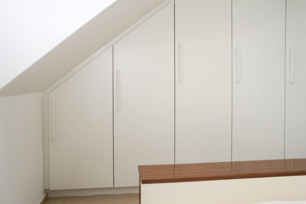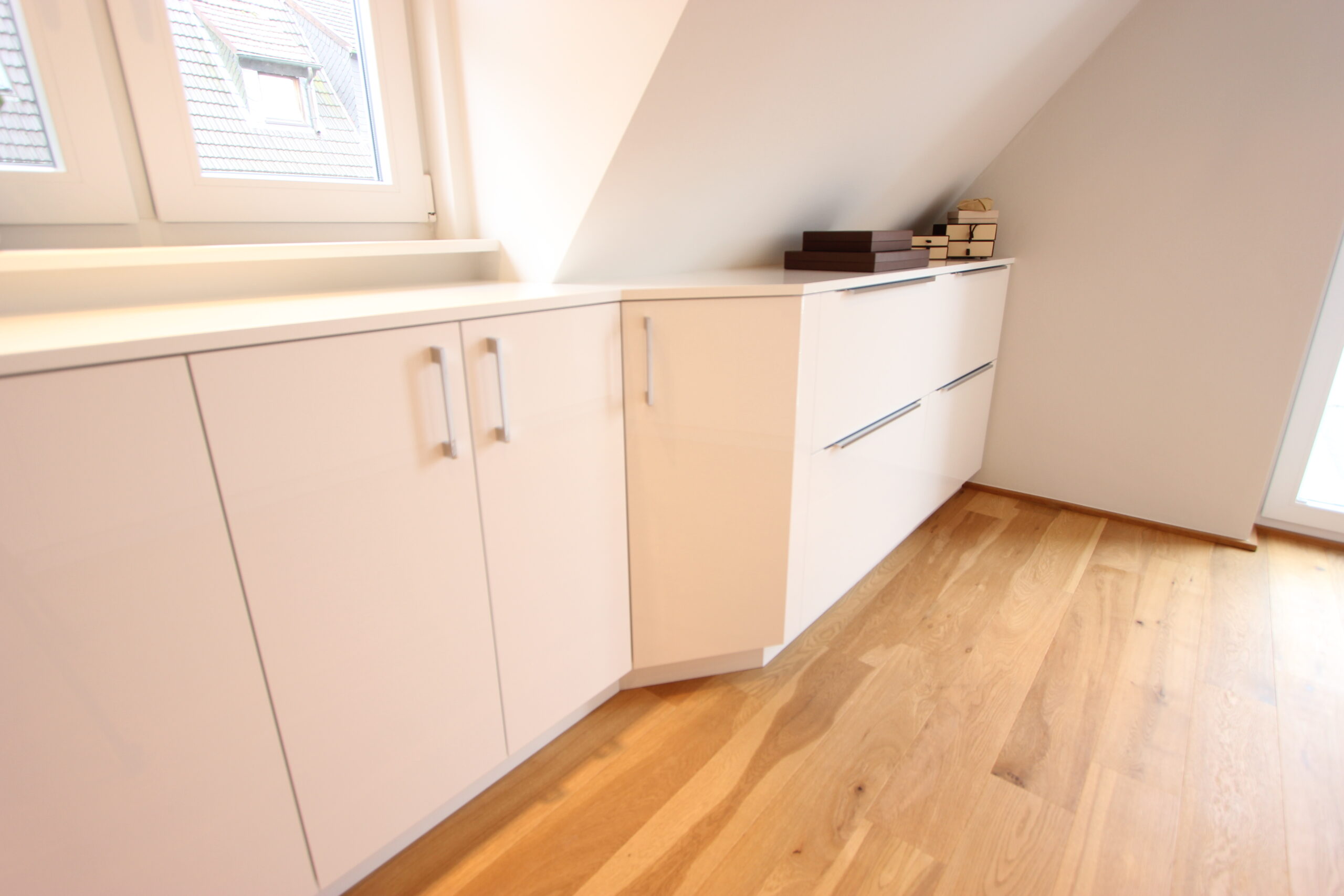 Optimale Nutzung einer niedrigen Dachschräge: Rollregale in edlem Weiß mit Edelstahl, Front glänzend.