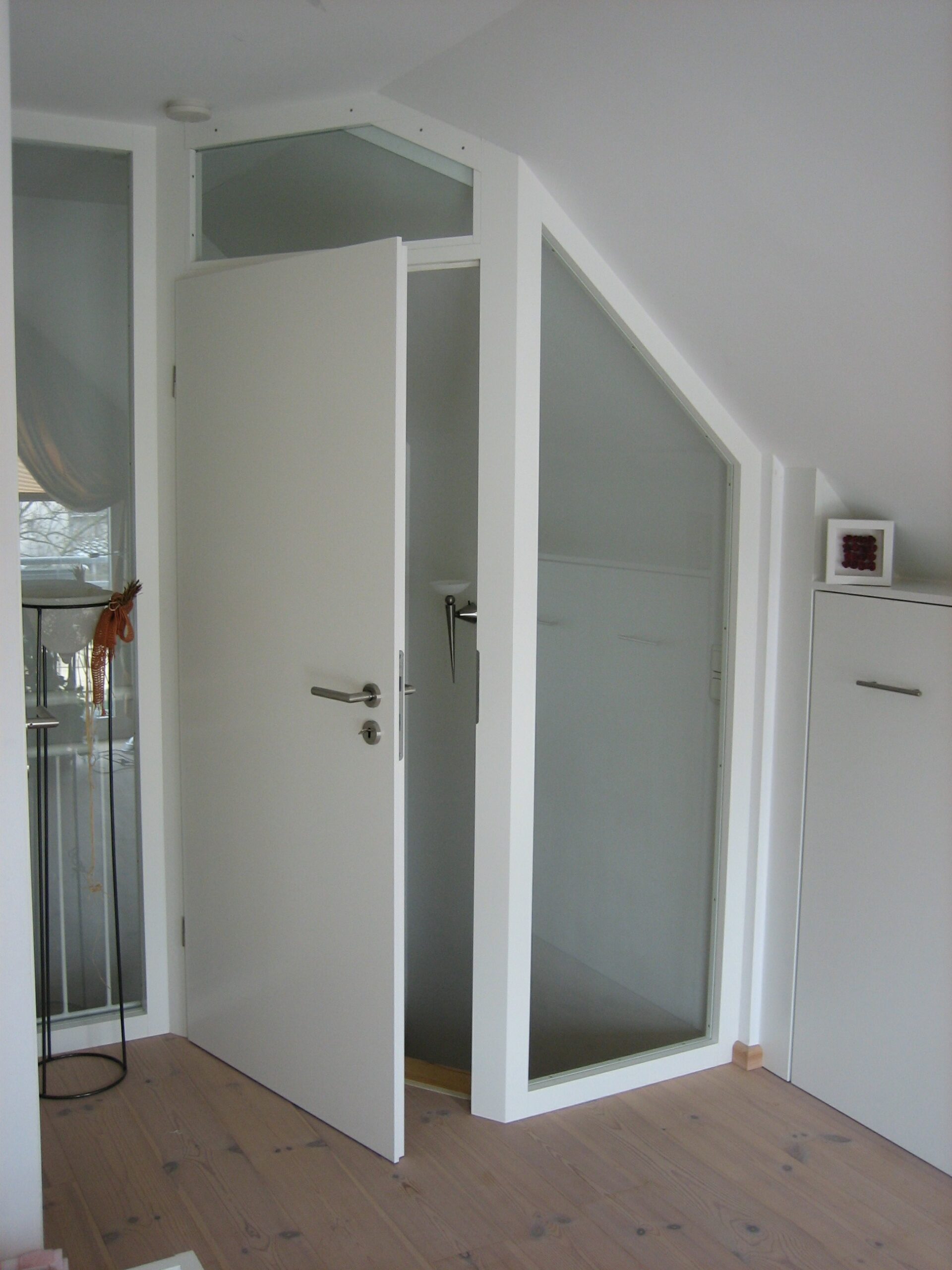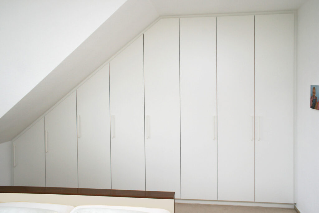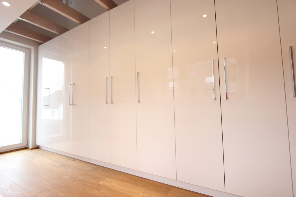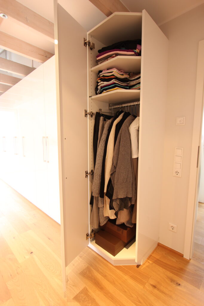 Viel Platz für Bekleidung, perfekt eingepasst in dezentem Weiß. Die Edelstahl-Griffe haben wir weiß pulverbeschichten lassen.